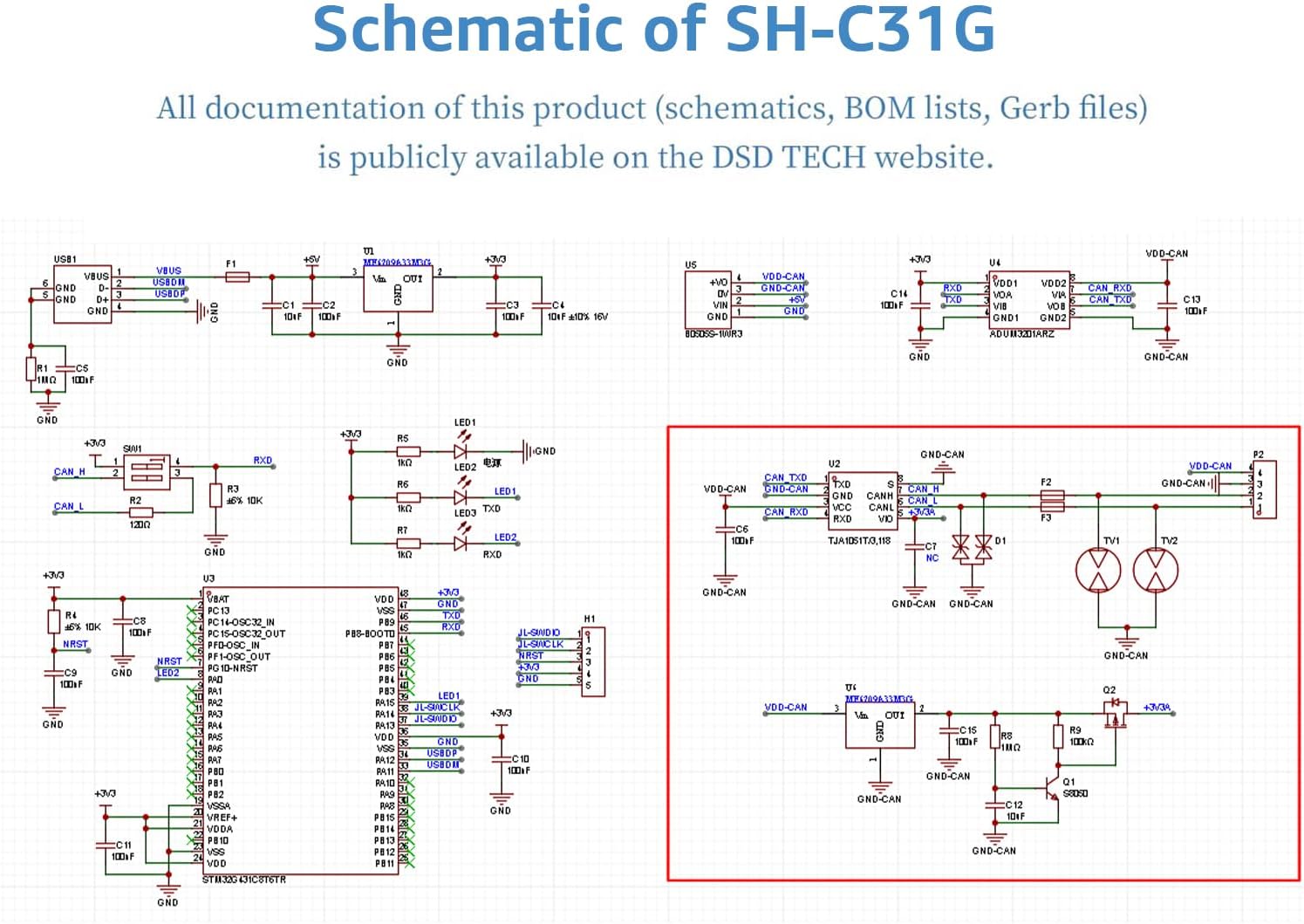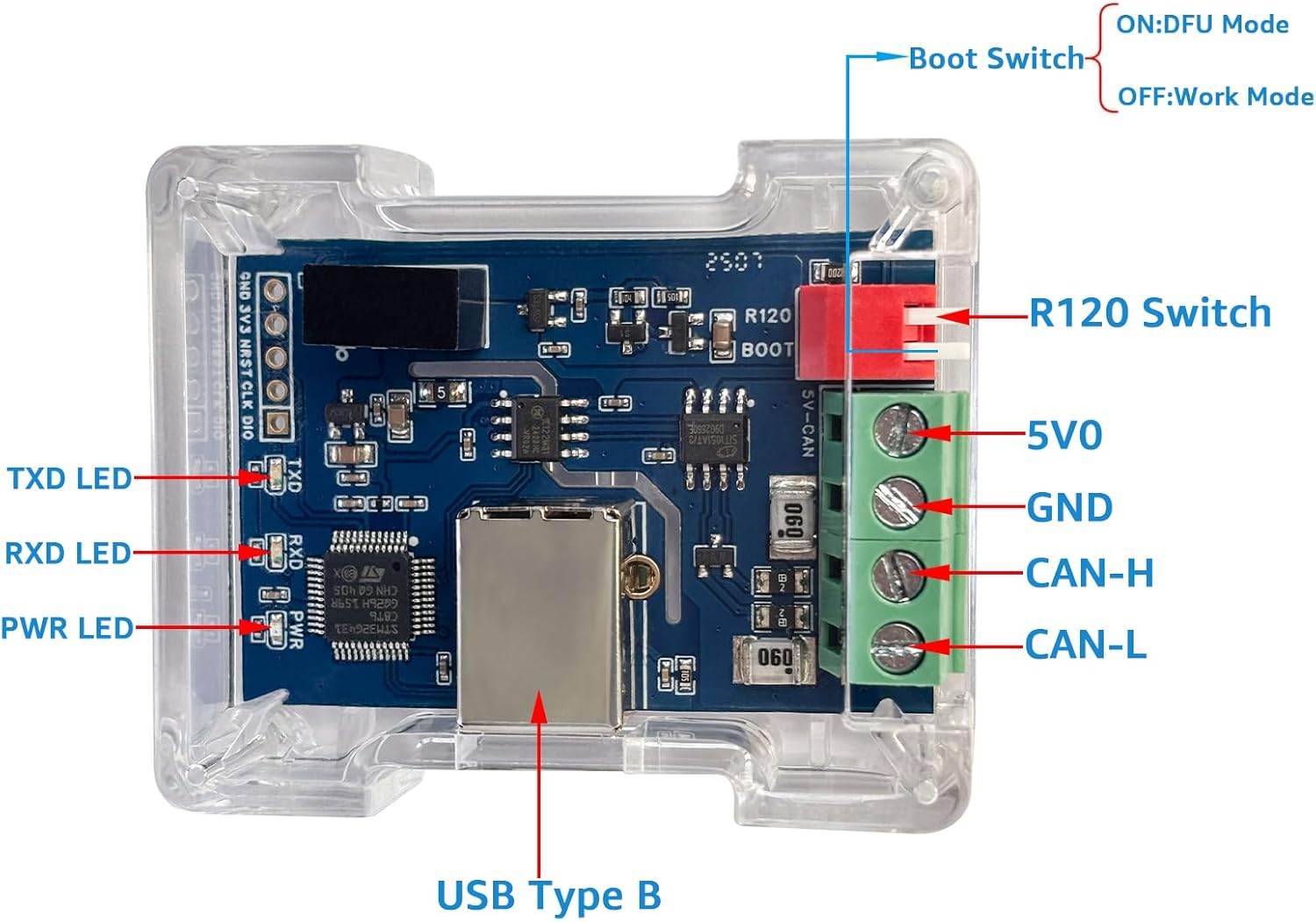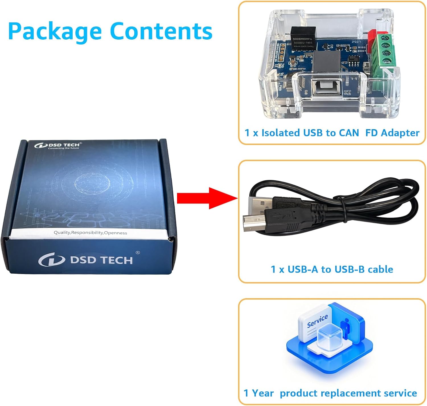 DSD TECH SH-C31G Isolated USB to CAN FD Adapter: An industrial-grade adapter featuring dual signal/power isolation for noisy environments. Supports CAN FD (after firmware flash) and legacy CAN 2.0A/B protocols. Plug-and-play with USB Type-B and terminal block. Cross-platform compatible (Windows/Linux/macOS). Based on the open-source Canable 2.0 design. Ideal for automotive, industrial, and robotics applications.